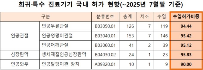 21일 이주영 개혁신당 국회의원이 식품의약품안전처로부터 제출받은 '의료현장 필수 의료기기 품목별 제조·수입 허가 현황' 자료에 따르면 올 7월말 현재 희귀·특수 진료기기인 인공관절(무릎·엉덩이·어깨), 심장판막(생체재질인공심장판막), 인공와우(인공달팽이관 장치) 등의 수입 허가비중이 각각 95%, 95.8%, 90%인 것으로 나타났다.