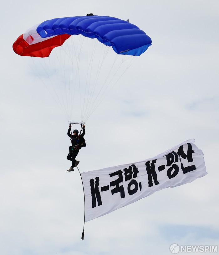 [성남=뉴스핌] 류기찬 기자 = 2025 서울 ADEX 개막일인 17일 오후 경기 성남시 서울공항에서 공군 특수부대 고공강하팀이 강하를 선보이고 있다. 2025.10.17 ryuchan0925@newspim.com