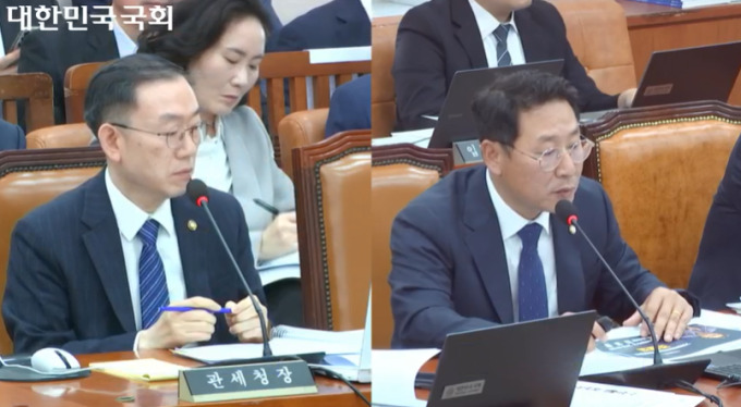 21일 열린 국회 기획재정위원회 국정감사에서 이명구 관세청장(왼쪽)과 김영환 더불어민주당 의원이 발언하고 있다. [사진=국회방송] 2025.10.21 plum@newspim.com |