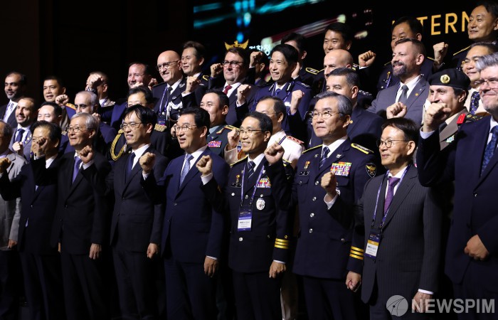 [서울=뉴스핌] 이형석 기자 = 유재성 경찰청장 직무대행이 21일 오후 서울 여의도 콘래드호텔에서 열린 2025 국제경찰청장회의 개회식에서 참석자들과 기념촬영을 하고 있다. 2025.10.21 leehs@newspim.com