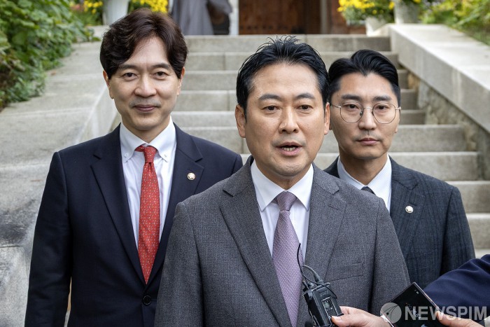 [서울=뉴스핌] 국회사진기자단 = 장동혁 국민의힘 대표가 21일 오후 서울 강남구 봉은사를 찾아 대한불교조계종 총무원장 진우스님을 예방해 환담을 마친 후 백브리핑을 하고 있다. 2025.10.21 photo@newspim.com