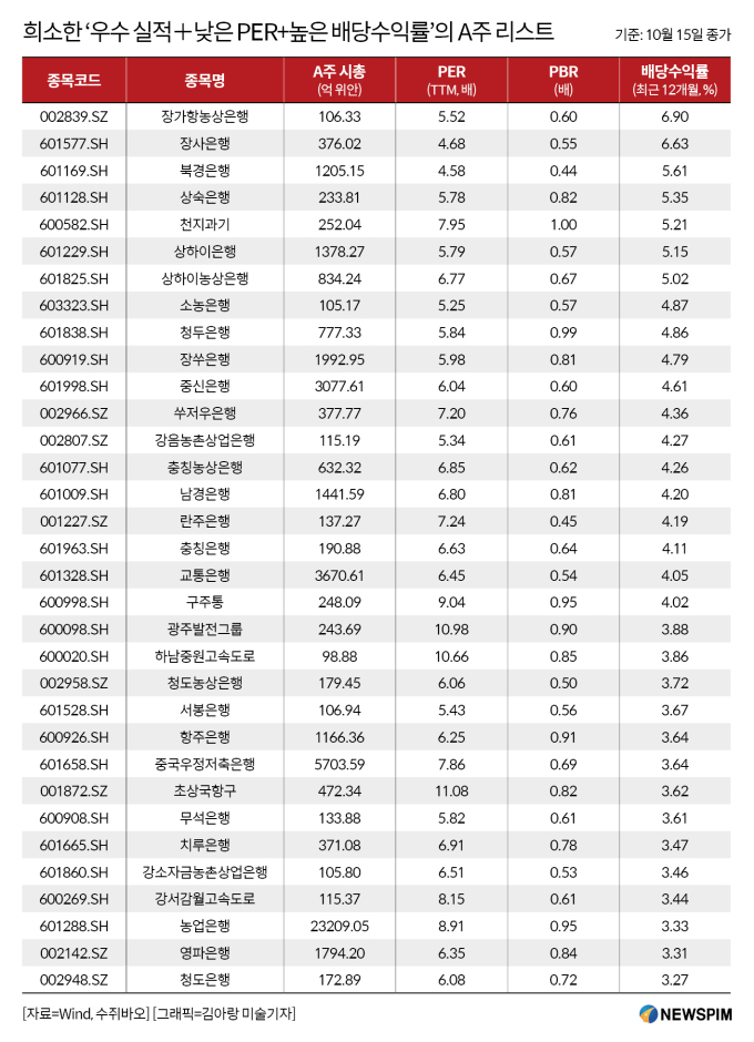 중국 관영 증권시보(證券時報) 산하의 데이터 산출 플랫폼 수쥐바오(數據寶)의 통계에 따르면 10월 15일 종가 기준으로 배당수익률(최근 12개월 기준)이 3%를 초과한 종목은 총 33개로 전체 포징주의 70% 이상을 차지했다.