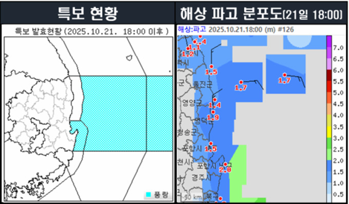 21일 오후 6시 기준 특보 현황(왼쪽)과 해상 파고 분포도[그래픽=기상청]2025.10.21 nulcheon@newspim.com |