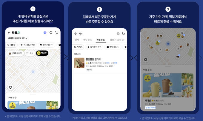 앱 편의성 개선과 함께 다양한 픽업 프로모션도 진행한다. 10월 26일까지는 전국 1400여 개 빽다방 매장에서 '아이스 아메리카노'를 100원에 제공하는 행사를 열며, 10월 한 달간 매일 1회씩 20~30% 할인 혜택도 제공한다. 또한 BBQ, BHC, 처갓집양념치킨, 자담치킨, 맘스터치, 피자헛 등 인기 프랜차이즈에서는 10월 말부터 11월 초까지 픽업 주문 시 최대 1만 원 할인 행사를 진행한다.