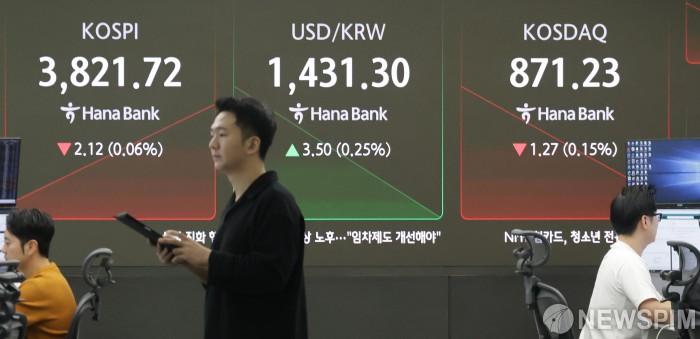 [서울=뉴스핌] 양윤모 기자 = 경주 APEC 정상회의를 앞두고 미국과의 관세 협상이 속도를 내는 가운데, 22일 오전 코스피가 전장 종가보다 2.12 포인트(0.06%) 하락하며 3821.72로, 코스닥은 1.27 포인트(0.15%) 하락한 871.23으로 장을 시작한 가운데, 서울 중구 하나은행 딜링룸에서 직원들이 업무를 보고 있다. 서울외환시장에서 달러/원 환율은 전장 대비 3.50원 상승한 1431.30원에 거래를 시작했다. 2025.10.22 yym58@newspim.com