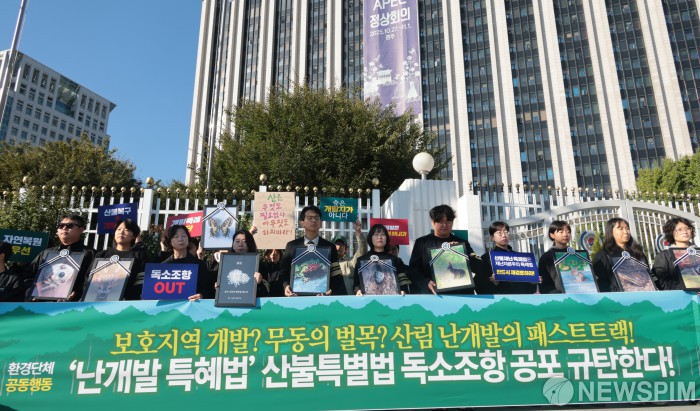 [서울=뉴스핌] 이길동기자= 131개 시민·환경단체 관계자들이 22일 오전 서울 종로구 정부서울청사 앞에서 기자회견을 열고, 각종 개발특례 독소조항을 담은 '경북·경남·울산 초대형 산불 피해 구제와 재건을 위한 특별법' (산불특별법)공포를 규탄하고 있다.2025.10.22 gdlee@newspim.com