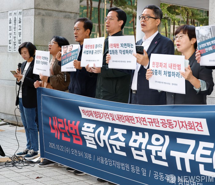 [서울=뉴스핌] 류기찬 기자 = 참여연대, 민주사회를 위한 변호사 모임이 22일 오전 서울 서초구 서울중앙지방법원 앞에서 '박성재 영장기각 및 내란재판 지연 규탄 공동기자회견'을 열고 구호를 외치고 있다. 2025.10.22 ryuchan0925@newspim.com