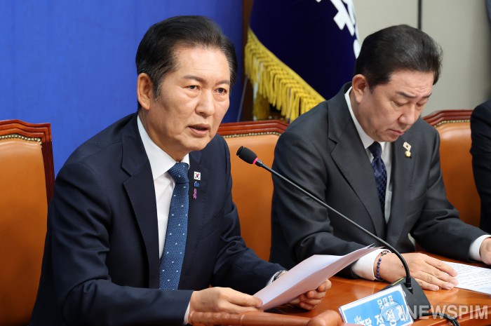 [서울=뉴스핌] 정일구 기자 = 정청래 더불어민주당 대표가 22일 오전 서울 여의도 국회에서 열린 최고위원회의에서 모두발언을 하고 있다. 2025.10.22 mironj19@newspim.com