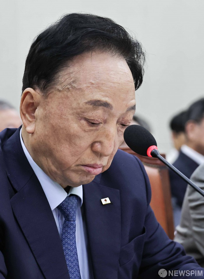 [서울=뉴스핌] 윤창빈 기자 = 김철수 대한적십자사 회장이 22일 오전 서울 여의도 국회에서 열린 보건복지위원회의 한국보건산업진흥원 등에 대한 국정감사에서 자료를 확인하고 있다. 2025.10.22 pangbin@newspim.com