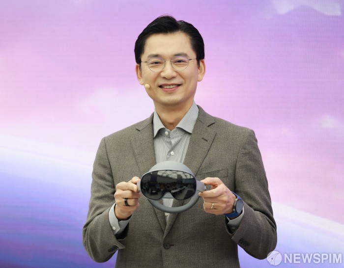 [서울=뉴스핌] 김학선 기자 = 삼성전자가 22일 오전 서울 서초구 삼성 강남에서 구글과 공동 개발한 확장현실(XR) 헤드셋 '갤럭시 XR' 미디어 공개행사를 열었다. 임성택 삼성전자 한국총괄 부사장이 '갤럭시 XR'을 소개하고 있다. 2025.10.22 yooksa@newspim.com