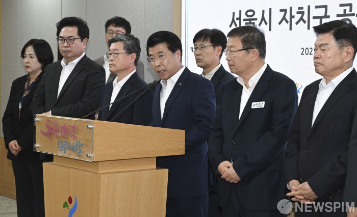 [서울=뉴스핌] 양윤모 기자 = 서강석 송파구청장이 22일 오후 서울시청 브리핑실에서 정부의 '10·15 부동산 대책'에 대한 자치구 공동 성명서 행사에서 모두발언을 하고 있다. 이날 행사에는 송파,광진,동대문,양천,영등포,서초,강동,중구,서대문,강남,용산의 구청장과 관계자들이 참석 했다. 2025.10.22 yym58@newspim.com
