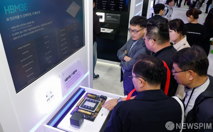 [서울=뉴스핌] 류기찬 기자 = 제27회 반도체대전(SEDEX 2025)이 개막한 22일 오후 서울 강남구 코엑스에서 관람객들이 삼성전자의 6세대 고대역폭 메모리인 HBM4와 HBM3E의 실물을 살펴보고 있다. 2025.10.22 ryuchan0925@newspim.com