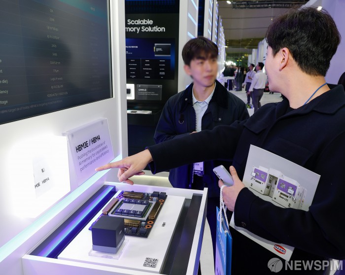 [서울=뉴스핌] 류기찬 기자 = 제27회 반도체대전(SEDEX 2025)이 개막한 22일 오후 서울 강남구 코엑스에서 관람객들이 삼성전자의 6세대 고대역폭 메모리인 HBM4와 HBM3E의 실물을 살펴보고 있다. 2025.10.22 ryuchan0925@newspim.com