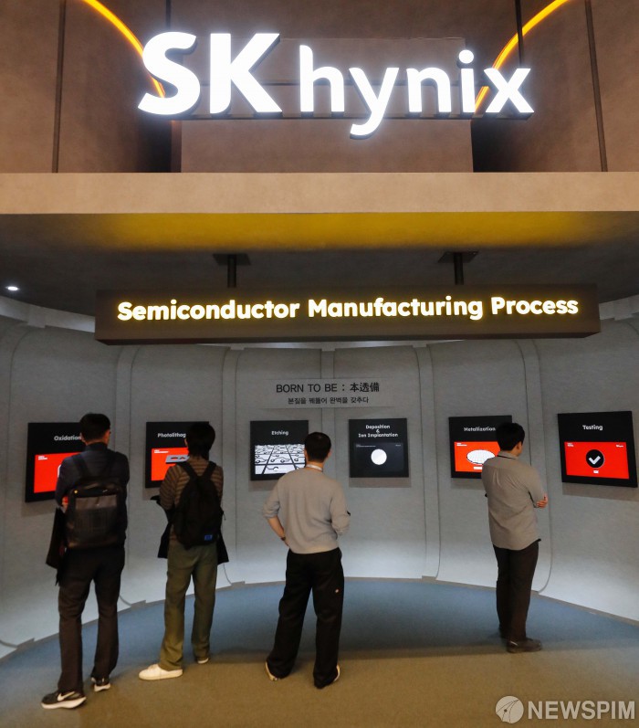[서울=뉴스핌] 류기찬 기자 = 제27회 반도체대전(SEDEX 2025)이 개막한 22일 오후 서울 강남구 코엑스에서 관람객들이 SK하이닉스의 부스를 살펴보고 있다. 2025.10.22 ryuchan0925@newspim.com