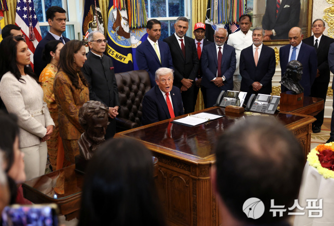 미국 워싱턴 D.C. 백악관 집무실에서 열린 힌두교 최대 명절 '디왈리(빛의 축제)' 기념 행사 중 도널드 트럼프 미국 대통령이 기자들의 질문에 답하고 있다(2025년 10월 21일).[사진=로이터 뉴스핌] |
