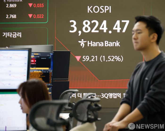 [서울=뉴스핌] 류기찬 기자 = 23일 오전 서울 중구 하나은행 딜링룸 전광판에 코스피 지수가 표시되고 있다. 이날 코스피 지수는 전장 대비 47.89포인트(1.23%) 내린 3835.79에, 코스닥 지수는 5.02포인트(0.57%) 내린 874.13에 장을 시작했다. 달러/원 환율은 전장보다 2.00원 오른 1431.80으로 출발했다. 2025.10.23 ryuchan0925@newspim.com