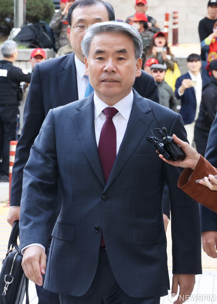 이 전 장관은 이날 오전 9시 47분께 중앙지법에 모습을 드러냈다. 해병대 예비역연대 관계자들이 법원으로 걸어가는 이 전 장관을 향해 "정신차리라"며 항의하기도 했다.