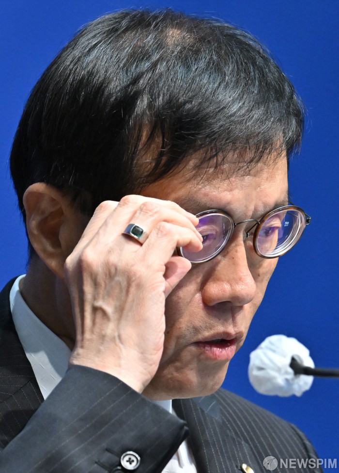 [서울=뉴스핌] 사진공동취재단 = 이창용 한국은행 총재가 23일 서울 중구 한국은행에서 열린 금융통화위원회 금리 결정에 대한 기자간담회에서 안경을 고쳐쓰고 있다. 2025.10.23 photo@newspim.com