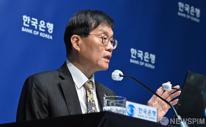 [서울=뉴스핌] 사진공동취재단 = 이창용 한국은행 총재가 23일 오전 서울 중구 한국은행에서 열린 금융통화위원회 본회의 후 기자간담회를 하고 있다. 2025.10.23 photo@newspim.com