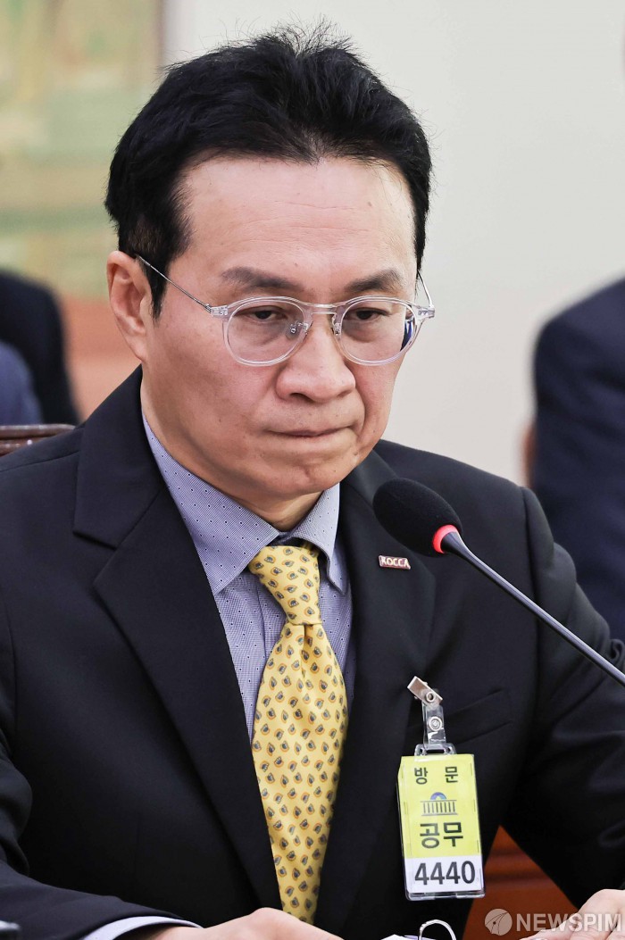 [서울=뉴스핌] 윤창빈 기자 = 유현석 한국콘텐츠진흥원장 직무대리가 23일 오전 서울 여의도 국회에서 열린 문화체육관광위원회의 한국콘텐츠진흥원 등에 대한 국정감사에서 의원 질문을 듣고 있다. 2025.10.23 pangbin@newspim.com