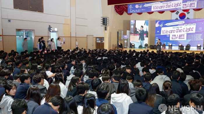 [용인=뉴스핌] 류기찬 기자 = 개그맨 장용이 23일 오후 경기 용인시 기흥구 구성중학교에서 열린 '2025 경기도교육청 찾아가는 생명존중 캠페인'에서 사회를 맡고 있다. 2025.10.23 ryuchan0925@newspim.com