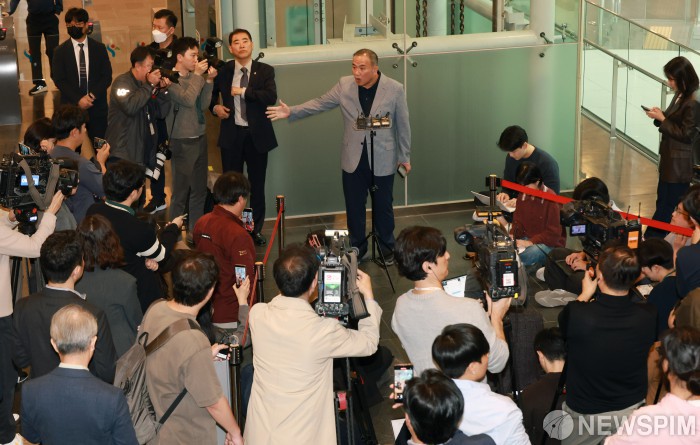 [서울=뉴스핌] 김학선 기자 = '정치 브로커'로 알려진 명태균 씨가 23일 서울시청에서 열린 국회 행정안전위원회 서울시 국정감사에 증인으로 출석 전 시청 로비에서 입장을 밝히고 있다. 2025.10.23 yooksa@newspim.com