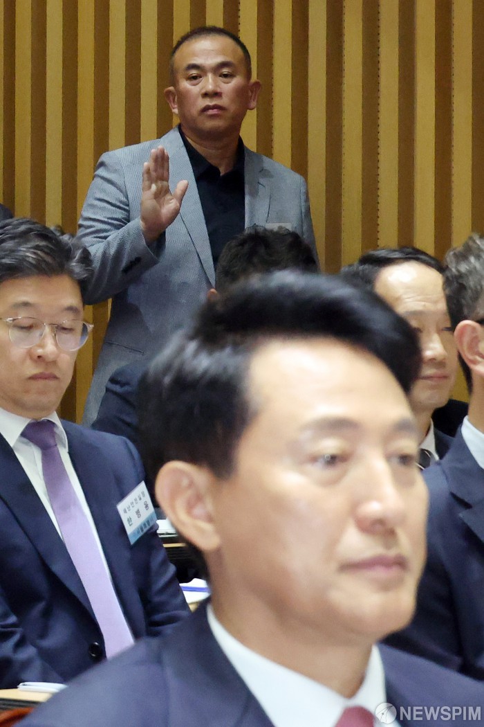 [서울=뉴스핌] 김학선 기자 = '정치 브로커'로 알려진 명태균 씨가 23일 오후 서울 중구 서울시청에서 열린 국회 행정안전위원회의 서울시청 국정감사에 증인 출석해 선서를 하고 있다. 2025.10.23 yooksa@newspim.com