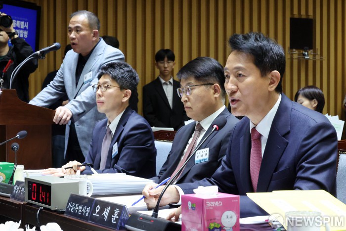 [서울=뉴스핌] 김학선 기자 = '정치 브로커'로 알려진 명태균 씨(왼쪽)가 23일 오후 서울 중구 서울시청에서 열린 국회 행정안전위원회의 서울시청 국정감사에 출석한 가운데 오세훈 서울시장이 의원 질의에 답변을 하고 있다. 2025.10.23 yooksa@newspim.com