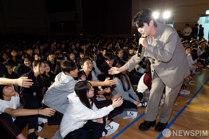 [용인=뉴스핌] 류기찬 기자 = 남성 보컬그룹 노을의 멤버 강균성이 23일 오후 경기 용인시 기흥구 구성중학교에서 열린 '2025 경기도교육청 찾아가는 생명존중 캠페인'에서 무대를 펼치고 있다. 2025.10.23 ryuchan0925@newspim.com