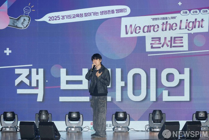 [용인=뉴스핌] 류기찬 기자 = 2025년 한국 비트박스 챔피언 잭브라이언이 23일 오후 경기 용인시 기흥구 구성중학교에서 열린 '2025 경기도교육청 찾아가는 생명존중 캠페인'에서 인사말을 하고 있다. 2025.10.23 ryuchan0925@newspim.com