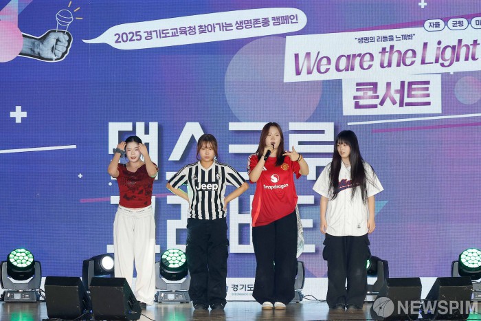 [용인=뉴스핌] 류기찬 기자 = 고교댄스크루 그래비티가 23일 오후 경기 용인시 기흥구 구성중학교에서 열린 '2025 경기도교육청 찾아가는 생명존중 캠페인'에서 인사말을 하고 있다. 2025.10.23 ryuchan0925@newspim.com