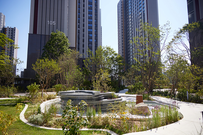 첫 적용 사례는 지난 7월 준공된 '천안 롯데캐슬 더 청당'이다. 깊은 계곡의 숲과 뜰로 쏟아지는 빛의 경관을 정원으로 구현했다. 중앙 수경시설은 곡선미와 레이어링 기법을 활용해 빛·물·바위 등 자연의 요소를 재해석하고 입체감을 더했다.