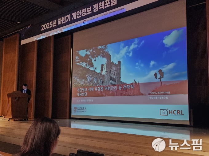 23일 개인정보보호위원회와 한국CPO협의회가 서울 한국광고문화회관에서 개최한 '2025년 하반기 개인정보 정책포럼' 현장. 김휘강 고려대학교 교수가 '개인정보 침해 유형별 위험관리 등 전략적 대응방안'을 주제로 발표하고 있다. [사진=양태훈 기자] |