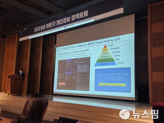 23일 개인정보보호위원회와 한국CPO협의회가 서울 한국광고문화회관에서 개최한 '2025년 하반기 개인정보 정책포럼' 현장. 지정호 비바리퍼블리카 최고정보보안책임자(Chief Information Security Officer, CISO)가 개인정보 보호 강화 우수사례를 발표하고 있다. [사진=양태훈 기자] |