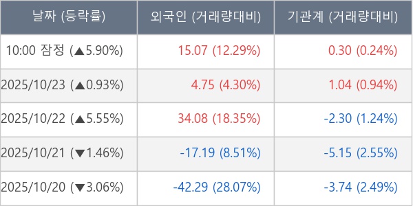 [서울=뉴스핌] 로보뉴스 = 24일 10시 15분 현재 이수페타시스(007660)는 외국인과 기관이 각각 15.07 만 주, 0.30 만 주 순매수(잠정) 하면서 전일 대비 5.90% (현재가 91,500원) 상승하고 있다.