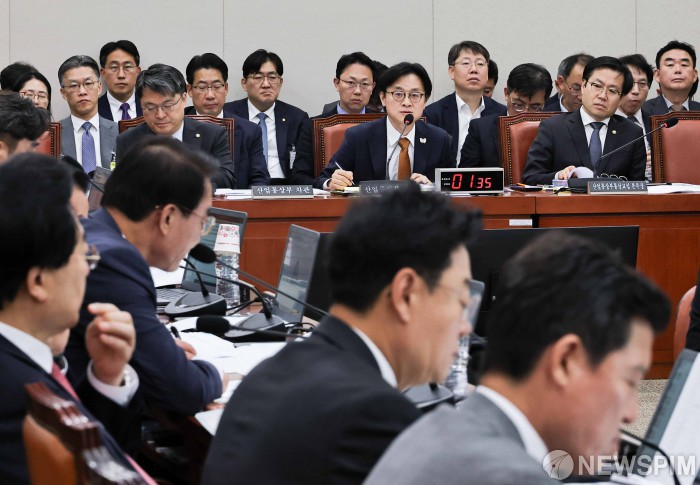 [서울=뉴스핌] 윤창빈 기자 = 김정관 산업통상부 장관이 24일 서울 여의도 국회에서 열린 산업통상자원중소벤처기업위원회의 산업통상부에 대한 종합감사에서 의원 질문에 답변하고 있다. 2025.10.24 pangbin@newspim.com