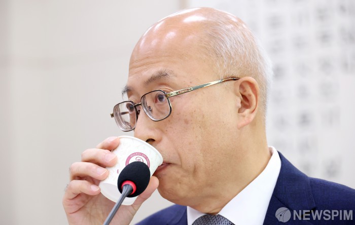 [서울=뉴스핌] 정일구 기자 = 조원철 법제처장이 24일 오전 서울 여의도 국회 법제사법위원회에서 열린 법제처에 대한 국정감사에서 물을 마시고 있다. 2025.10.24 mironj19@newspim.com