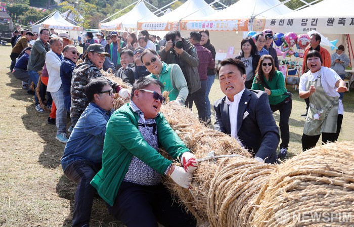 [서울=뉴스핌] 양윤모 기자 =24일 오후 경기도 이천시 이천농업테마공원에서 열린 '제24회 이천쌀문화축제'행사중 하늘공원에서 각읍면동 줄다리기 대회가 펼쳐지고 있다.'맛과 멋이 어우러진, 쌀로 잇는 즐거움'이란 주제로 열리는 올해 축제는 다양한 참여 및 체험 행사와 전통 공연 등으로 26일까지 열린다. [사진=이천시청] 2025.10.24 yym58@newspim.com
