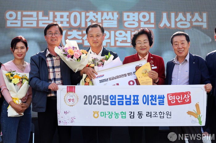 [서울=뉴스핌] 양윤모 기자 =24일 오후 경기도 이천시 이천농업테마공원에서 열린 ‘2025년 임금님표이천쌀 명인 선발대회 시상식’에서 명인으로 선발된 김동리 명인(좌측에서 3번째)이 김경희 이천시장과 기념사진을 촬영하고 있다. '맛과 멋이 어우러진, 쌀로 잇는 즐거움'이란 주제로 열리는 올해 축제는 다양한 참여 및 체험 행사와 전통 공연 등으로 26일까지 열린다. [사진=이천시청] 2025.10.24 yym58@newspim.com