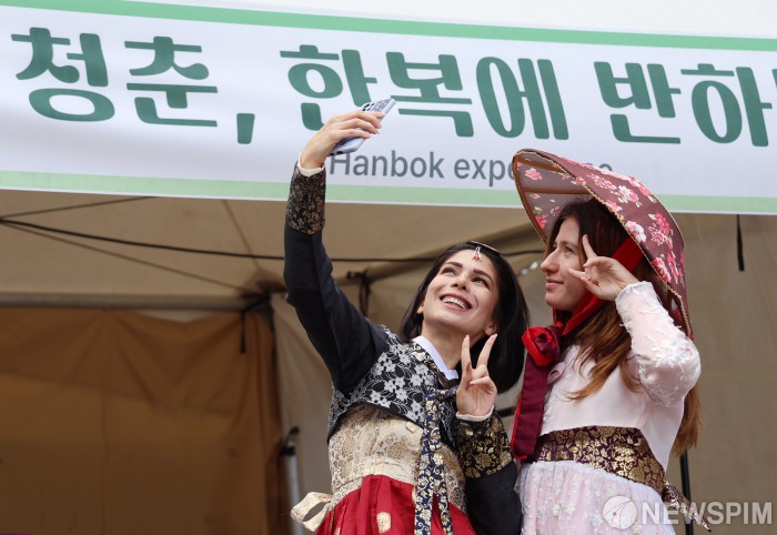 [서울=뉴스핌] 양윤모 기자 = 24일 오후 부산시 동래구(구청장 장준용)가 주최한 '제31회동래읍성역사축제'를 찾은 외국인 방문객들이 한복 체험을 하고 있다. ‘동래성 사람들, 역사와 미래를 잇다’라는 새로운 슬로건으로 열리는 올해 축제는 동래성 항전 이야기에 4차 산업 기술을 접목한 새로운 체험과 공연으로 오는 26일까지 동래문화회관, 동래읍성광장, 명륜1번가, 온천천카페거리, 온천장, 청소년센터, 혁신어울림센터 일원에서 진행된다. [사진=동래구청] 2025.10.24 yym58@newspim.com