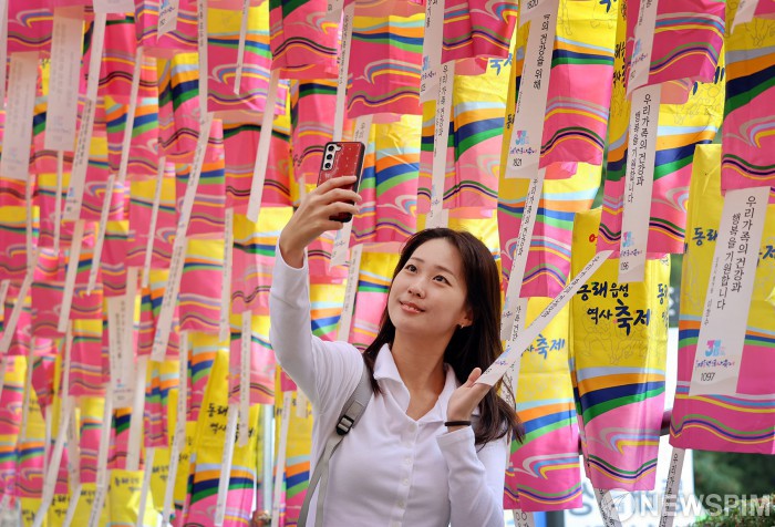 [서울=뉴스핌] 양윤모 기자 = 24일 오후 부산시 동래구(구청장 장준용)가 주최한 '제31회동래읍성역사축제'를 찾은 방문객들이 소망등 터널에서 기념사진을 촬영하고 있다. ‘동래성 사람들, 역사와 미래를 잇다’라는 새로운 슬로건으로 열리는 올해 축제는 동래성 항전 이야기에 4차 산업 기술을 접목한 새로운 체험과 공연으로 오는 26일까지 동래문화회관, 동래읍성광장, 명륜1번가, 온천천카페거리, 온천장, 청소년센터, 혁신어울림센터 일원에서 진행된다. [사진=동래구청] 2025.10.24 yym58@newspim.com