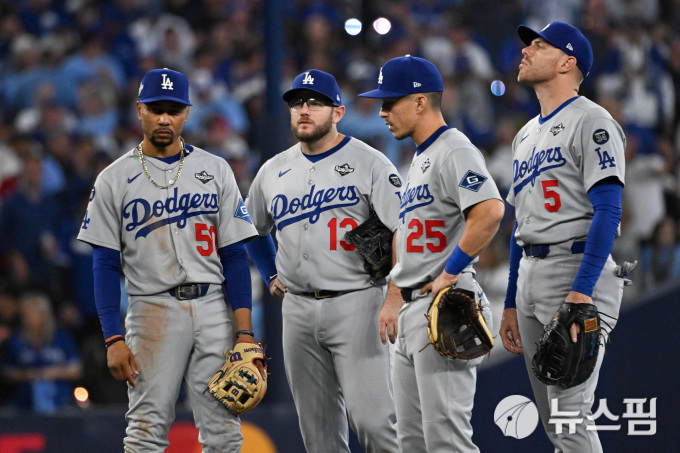 [토론토 로이터=뉴스핌] 장환수 스포츠전문기자= LA 다저스 내야진이 6회 투수 교체가 되는 동안 한데 모여 얘기를 나누고 있다. 왼쪽부터 유격수 무키 베츠, 3루수 맥스 먼시, 2루수 토미 에드먼, 1루수 프레디 프리먼. 2025.10.25 zangpabo@newspim.com