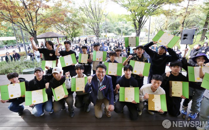[서울=뉴스핌] 양윤모 기자 = 오승록 노원구청장이 25일 오후 서울 노원구 노해체육공원에서 열린 2025 노원 청소년 액티브 페스타 ‘우다다’에 참석해 수상자들과 기념촬영을 하고 있다. 행사장은 ▲스포츠 마당 ▲공연 마당 ▲체험 마당 ▲피크닉존으로 구성돼 공원의 특성을 살려 운영됐다. 스포츠 마당에서는 유소년 풋살, 청소년 3:3 농구, X-게임 등 청소년 맞춤형 스포츠 대회가 펼쳐졌다. 특히 서울 동북권 최초의 X-게임장 ‘노원 X-TOP’에서는 스케이트보드, BMX, 인라인 어그레시브, 스턴트 스쿠터 등 4개 종목의 X-게임 대회가 열려 짜릿하고 역동적인 현장을 연출했다. [사진=노원구청] 2025.10.25 yym58@newspim.com
