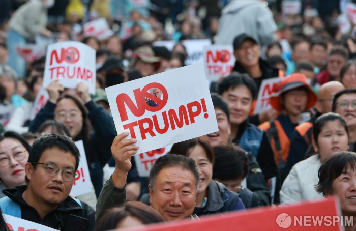 [서울=뉴스핌] 김학선 기자 = 25일 서울 중구 세종대로에서 열린 경제수탈, 일자리파괴 NO트럼프 민주노총 결의대회에서 참가자들이 피켓을 들고 있다. 2025.10.25 yooksa@newspim.com