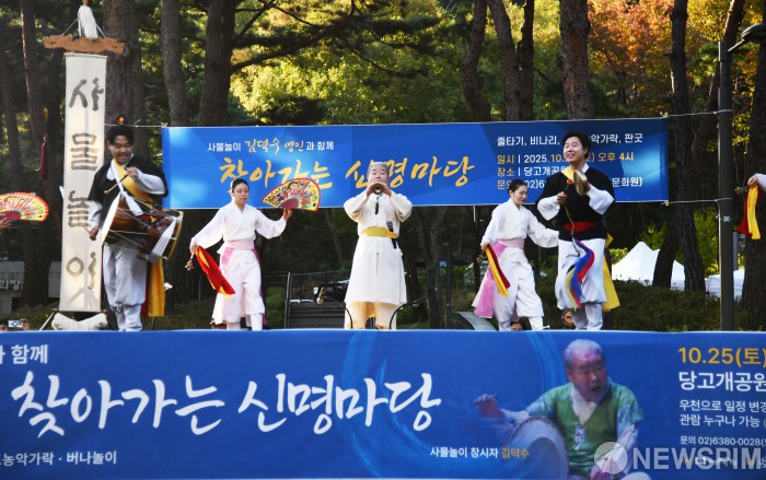 [서울=뉴스핌] 양윤모 기자 = 25일 오후 서울 노원구 수락산 당고개공원에서 오승록 노원구청장이 참석한 가운데 '찾아가는 신명마당'가 개최됐다. 이번 행사는 구민들이 일상 가까이에서 전통문화의 멋과 흥을 즐길 수 있도록 마련된 자리로, 김덕수 명인과 사물놀이패 이서&예성의 사물놀이, 줄타기 공연 등이 펼쳐졌다. [사진=노원구청] 2025.10.26 yym58@newspim.com