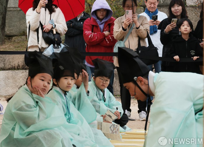 [서울=뉴스핌] 이길동 기자 = 시월의 마지막 휴일인 26일 오전 서울 종로구 창경궁 함인정 앞마당에서 열린 조선시대 유생 중양절 특별 과거시험 ‘구일제’에 참가자들이 유생복을 입고 왕에 대한 인사법을 배우고 있다. 국가유산청 궁능유적본부와 국가유산진흥원은 24일부터 26일까지 서울 창경궁에서 전통 명절 '중양절(重陽節)'을 주제로 한 '궁궐 일상 모습 재현 및 체험'을 개최했다. 2025.10.26 gdlee@newspim.com