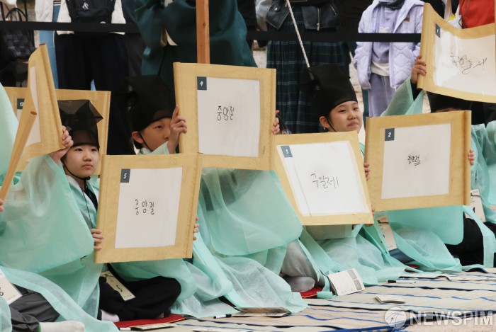 [서울=뉴스핌] 이길동 기자 = 시월의 마지막 휴일인 26일 오전 서울 종로구 창경궁 함인정 앞마당에서 열린 조선시대 유생 중양절 특별 과거시험 ‘구일제’에 참가자들이 유생복을 입고 중양절과 조선 역사, 국가유산 관련 문제를 풀고 있다. 국가유산청 궁능유적본부와 국가유산진흥원은 24일부터 26일까지 서울 창경궁에서 전통 명절 '중양절(重陽節)'을 주제로 한 '궁궐 일상 모습 재현 및 체험'을 개최했다. 2025.10.26 gdlee@newspim.com