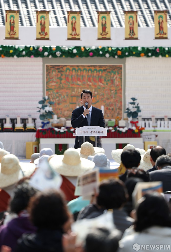 [서울=뉴스핌] 오세훈 서울시장이 지난 25일 서울 은평구 진관사에서 열린 수륙재 개건 627주년 기념 ‘2025년 진관사 수륙재’ 회향식에서 인사말을 하고 있다. [사진=진관사] 2025.10.26 photo@newspim.com