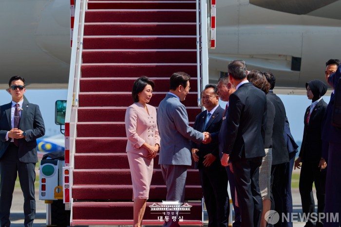 [서울=뉴스핌] 이재명 대통령과 김혜경 여사가 지난 26일(현지 시간) 말레이시아 쿠알라룸푸르 국제공항에 도착하고 있다. [사진=대통령실] 2025.10.27 photo@newspim.com