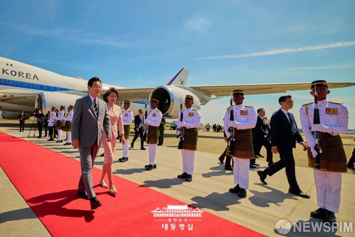 [서울=뉴스핌] 이재명 대통령과 김혜경 여사가 지난 26일(현지 시간) 말레이시아 쿠알라룸푸르 국제공항에 도착하고 있다. [사진=대통령실] 2025.10.27 photo@newspim.com